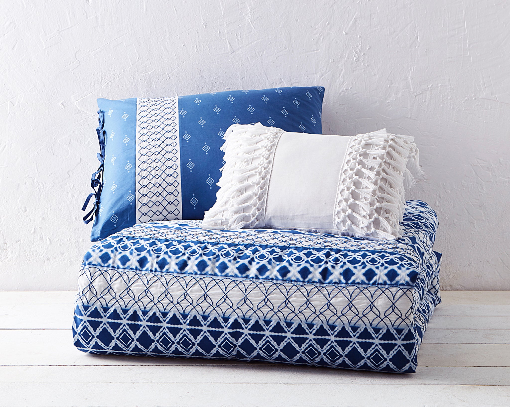 This oversized dec pillow in 100% cotton features all over Shibori print with bands of geometric embroidery and ties on one end. This pillow has all the perfect accents to enhance your "Boho" inspired look.